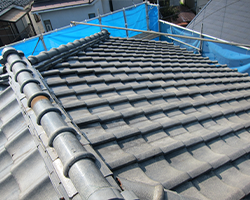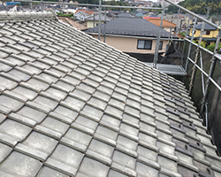 築30年の陶器瓦屋根の雨漏りを解消するため、コロニアル屋根へ貼りかえる工事となります。