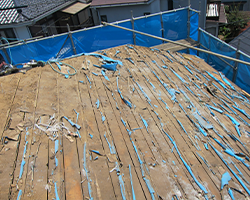 瓦を撤去し、針葉樹合板と防水シートを順に貼っていきます。