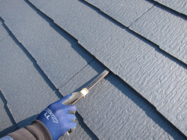 屋根材と屋根材が重なっている部分の隙間に、雪止め金具を差し込みます。