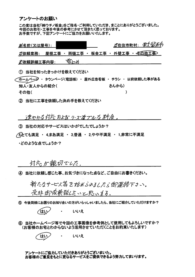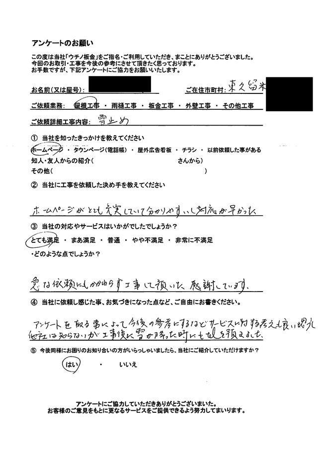 実際に東久留米市で雪止め設置を依頼されたお客様のリアルな声も掲載しているので、依頼した際のイメージが付きやすくなります。