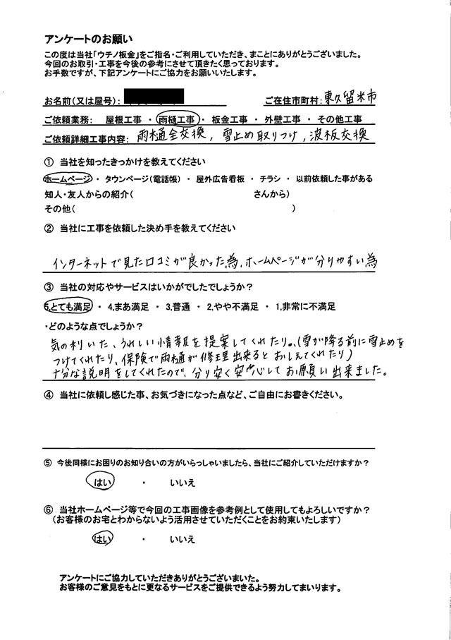 本章では、東久留米市で実際に雪止め設置をご依頼いただいたお客様の声を紹介します。