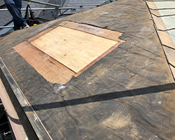 劣化が進んでいたため、既存の屋根材をすべて撤去し、そのうえで古い下地のうえに構造用合板を貼りつけて下地を強くしました。