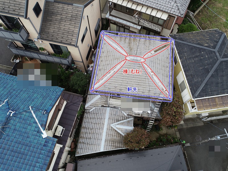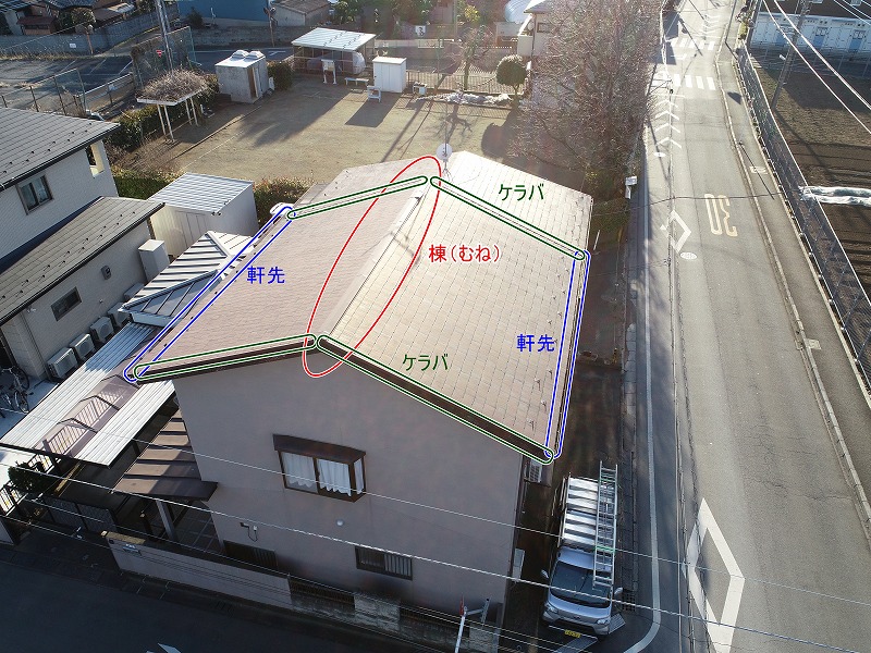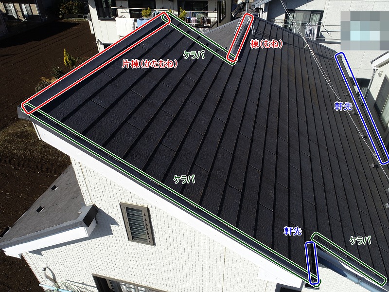 基本的に屋根面が4面ありその面が合わさって造る形で、頂上の棟(むね)を 大棟(おおむね) 、その大棟から四方の角 (出隅(ですみ)) に伸びている棟を 隅棟(すみむね) 、雨樋が付いている屋根面の端を 軒先 と呼びます。