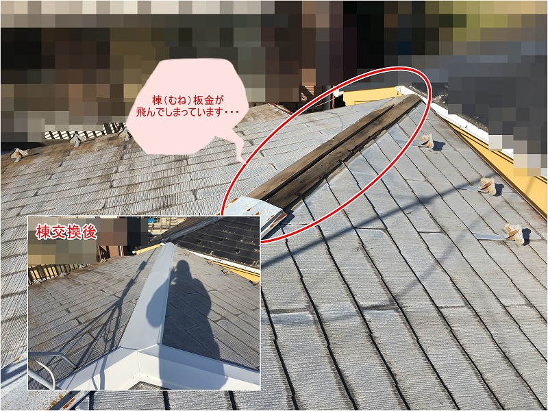 経年劣化により下地木材がやせ細ってしまい、釘が抜け棟が飛んでしまった状態です。