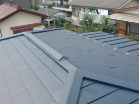 下葺き材の上にガルバリウム鋼板の新しい瓦棒屋根材を取り付けたら、雨漏り修理は完了です。