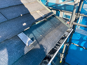 既存のかわらU屋根の下には、以前重ね葺き工事でカバーされたコロニアル屋根がありましたが、下地とともに交換修理します。