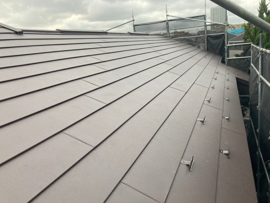 かわらU撤去後、アイジー工業の「スーパーガルテクト」で仕上げた工事です。高耐久のガルバリウム鋼板は軽量でメンテナンスも20年以上不要です。