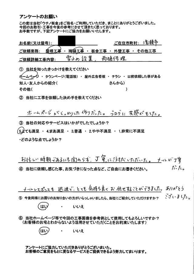 太陽光パネル点検の際に屋根にヒビが入っている箇所があるとの指摘を受けたのですが、その業者さんの対応に不信感を抱き、地元の業者さんに見積もりをお願いしました。その中で、ウチノ板金さんが一番早く丁寧に対応して下さり、見積もりも一番安く出して頂いたので、工事をお願いしました。 初めは壊れた部分だけの補修を考えていましたが、耐久性を考えて屋根のカバー工法工事をお願いしました。同時にエアコンスリムダクトとカーポートの雨樋の取り付けもお願いしました。 屋根の補修箇所確認の時にドローンで撮影した写真を送って下さり、工事終了時にも工事前後の詳しい写真を送って下さり、自分たちでは確認しにくい箇所も確認することが出来て納得できました。 工事に関する内容など迅速に丁寧にご連絡下さり、工事に来られた方々も誠実な感じで、安心して工事をお任せ出来ました。 また何かあったら、ご相談させて頂きたいと思います。